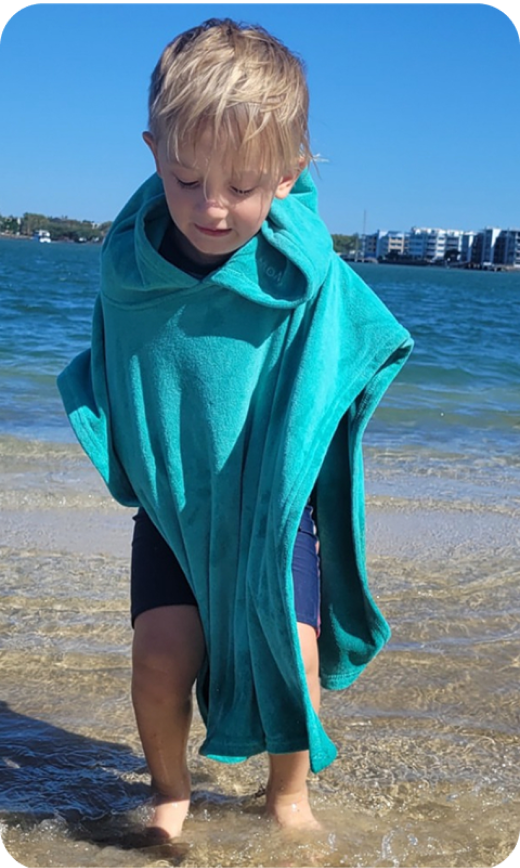 Hooded woviis or ponchos are available in 2 sizes are suitable for kids ages 2 to 6 years and for 7 to 10 years. The larger size is 10cm longer and 10cm wider than the small, with a larger neck cut out and hood size.